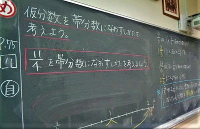 算数は、分数の授業です。分数が1より小さい「真分数」と1以上の「仮分数」に分類されることを学び、今日は「帯分数」も学習しました。分母より分子の方が大きい分数を帯分数に直す方法を考えて、練習問題を解きました。