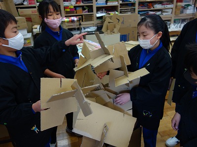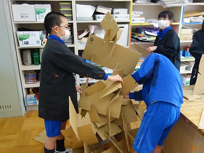 片付ける時に、壊れてしまったグループもありましたが、作品展前直前に修正して全校に発表する予定です。