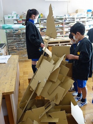 長くなったこの学習も、今日が最終です。なかなか立ち上がらなかったのですが、今日はようやくコツをつかんだのか、3グループとも大人の背丈を超えるくらいの高さになりました。