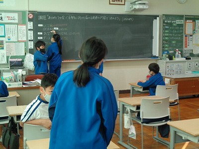 1時間目は学級活動です。今日は、6年生を送る『ありがとうの会』に向けて、どんな発表をするかについて話し合いました。議長団を中心に、クラスでの話し合いが進みます。アイディアを出し合い、いろいろな意見が出てきました。
