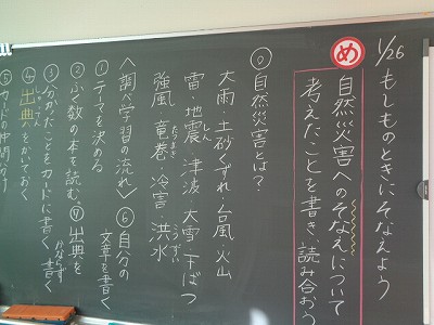 1時間目は、国語の学習を行いました。今日から、「もしものときに備えよう」という単元に入ります。これまで、さまざまな調べ学習を通して、書く力を学んできましたが、今回は「自然災害へのそなえ」について、調べた事を1つの文に仕上げます。今日は、災害のテーマを決めました。