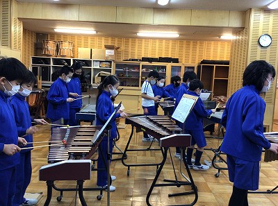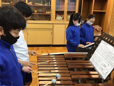 教科書では、リコーダーのパートを担当する鉄琴チームです。“オブリガード”といわれるメロディとは全く別の音楽の流れを、鉄琴の伸ばす音と切れる音を使い分けて演奏しています。