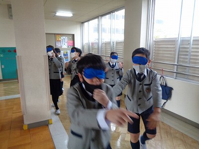 現在、月かげでは人権学習として、視覚障害のある方への理解を深めています。先週は点字について学習をしましたが、今日はアイマスクを使って視界を遮り、暗闇の世界で生活する大変さを実感しました。アイマスクをつけて音楽室までの廊下を歩くと、頼りになるのは「音」や「てすり」などです。「とても怖かった」という感想がたくさん上がり、近くに人がいて援助をしてもらうことが、暗闇の中でどれだけ救われるかという事を実感したようです。