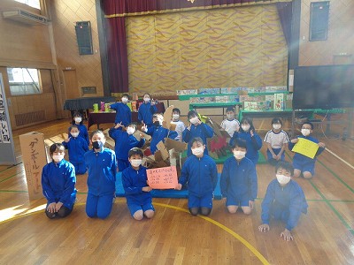 今日は、作品展が最終日となり、図工で作成した立体作品のダンボールアートも解体することになります。最後に、みんなでダンボール作品と記念撮影を行いました。