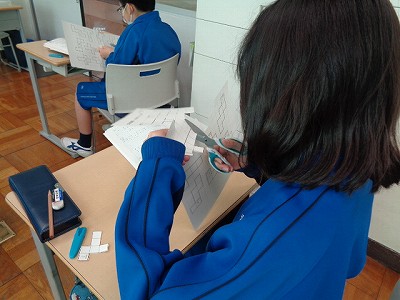 立方体の展開図は全部で11種類、それぞれの立方体を実際に切って作りながら、どの辺がどの辺と重なるのかを考えていきました。