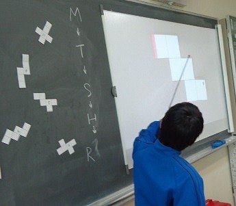 算数は「直方体と立方体」の単元について学習しています。今日は「立方体の展開図」を使用して、展開図ではどの辺がどの辺と重なるのか、頭の中で展開図を組み立てる練習を行います。