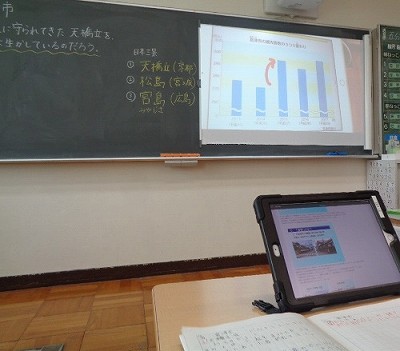 社会は、宮津市についての学習を進めています。今日は、日本三景である天橋立は、その美しさを生かしてどのような取り組みを行っているのかについて、調べ学習をしながら、話し合いました。観光客の推移を表したグラフから、観光客が増えたきっかけを予想して考えました。