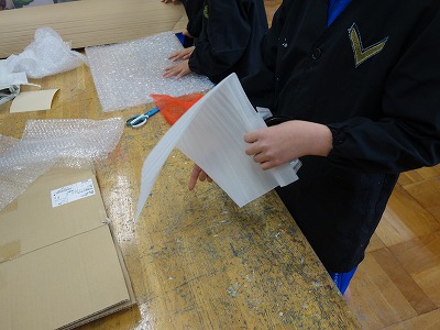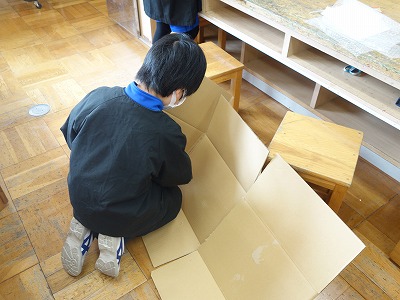 そこでまず、支持体となる画面をどうするか考えます。ダンボールや、木の板などを選ぶ児童が多かったようです。もちろん、大きさも自分で決めます。