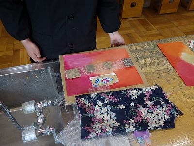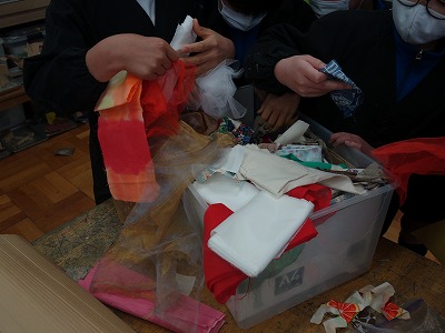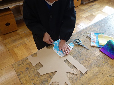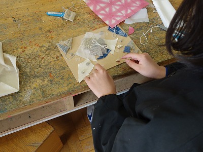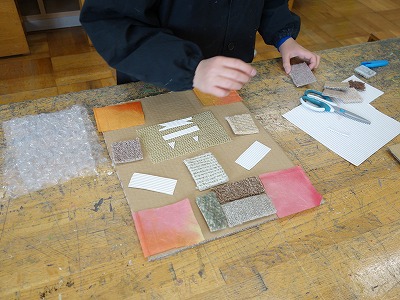 これは、造形室にある布きれや緩衝材、毛糸などといった材料を画面に貼り付け、絵に表していく活動となります。それぞれの材料の形や色などの組合わせを生かして、気に入った感じに仕上げていくことがめあてです。