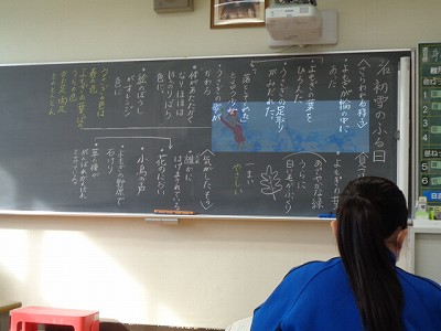 1時間目は国語の学習です。今週から「初雪のふる日」という単元の学習を行っています。前回に引き続き、「少女の見えているもの」と「ふしぎな世界へさらわれていく様子」の2つの視点から読み深めていきます。