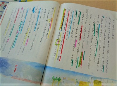 3時間目の国語は「初雪のふる日」の学習が続きます。昨日から読み深めたお話の中で、「表現を豊かにする言葉を探そう」という学習目標を持ち、天気を表す言葉や色を表す言葉、対比や修飾の言葉を第二場面の文章から探し出しています。それぞれの言葉で色分けをして、教科書のあらゆる表現を見つけていきました。色のついた言葉で一杯になった本文を見て、1つの場面だけで、これだけ多くの「情景」を表す言葉があるのかと驚いた様子の4年生。物語文には、表現をひろげる様々な工夫があるということが分かりました。
