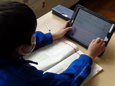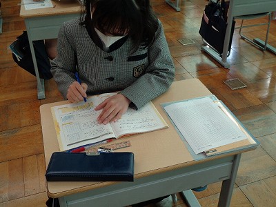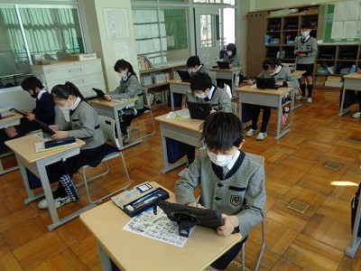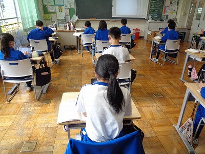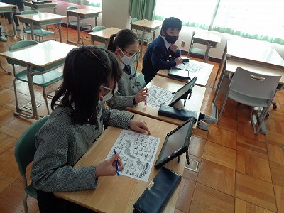 1時間目の算数は、直方体と立方体のまとめを行いました。これまでの学びをいかして、教科書の演習問題を解き、みんなで答え合わせをしました。展開図や見取り図などの作図もポイントとなってくる単元です。定規を使って丁寧に問題に向き合います。