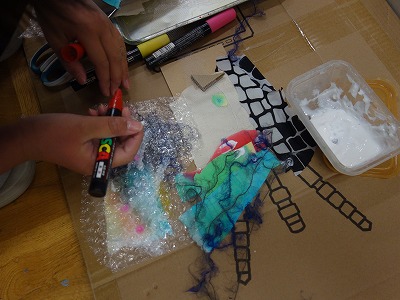 また、緩衝材(プチプチ)も丸い形に着目し、周りの材料よりも目立つ色に着色している児童もいました。