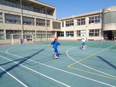 大縄とびをした後、一輪車にも取り組みました。久しぶりの一輪車に、みんな喜びいっぱい!一輪車に乗って、ぐるぐるとグラウンドを回っていました。