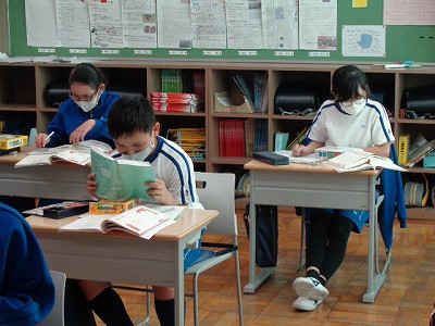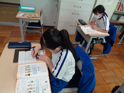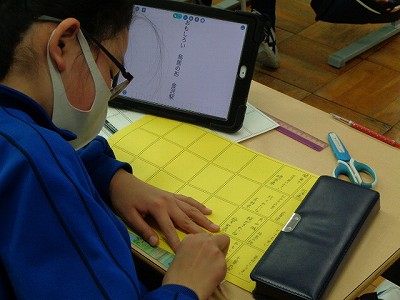 6時間目は社会です。先週から「都道府県カルタ」の作成を行っています。6つのチームに分かれ、47都道府県の読み札を、それぞれの県の物産や特徴などを交えながら、5・7・5で作成しています。いよいよ読み札や絵札の作成に入りました。チームで力を合わせて、分担しながら作成していきます。