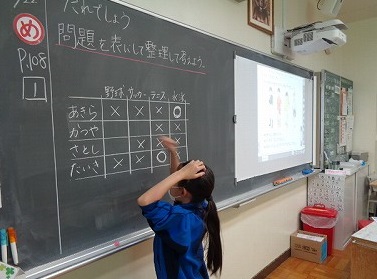 与えられた証言を表にまとめ、推理をしていきます。しっかりと問題の意味を読みとくことがポイントでした。