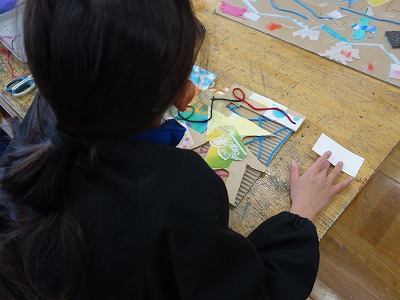鑑賞会では、友達と一緒に 材料や色の組合わせのおもしろさを味わいながら、見ることを楽しむことができました。