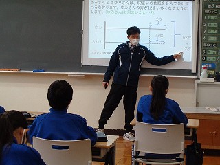 5時間目は、算数です。今日は、直方体と立方体のテストを行いました。その前に、毎日の宿題プリントで出題されていた問題について解説を行います。今日は、「和差算」といわれる文章問題の解き方について学習しました。線分図で確認しながら、計算方法を学びました。