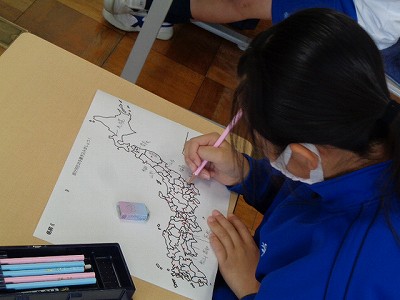 昼根っこタイムは「県庁所在地テスト」を行います。「那覇」など難しい漢字も出てくる県庁所在地ですが、漢字でのパーフェクトを狙う人も沢山います。「高松」「松山」「松江」など、ややこしい県庁所在地も。それぞれの場所を確認しながら書き込みました。