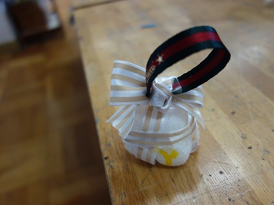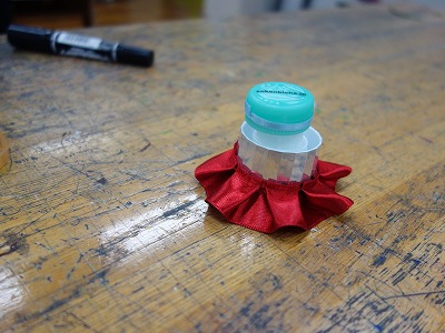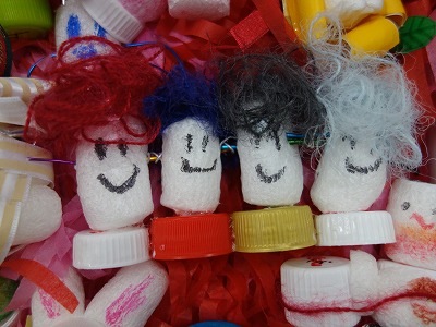 緩衝材ではなく、ペットボトルキャップを2つ合わせ、リボンで飾った作品もありました。置いておくのも楽しそうです。