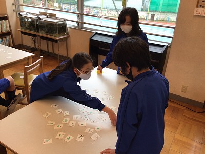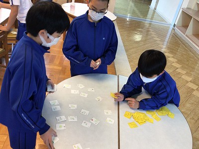 6時間目の社会は、自分達の作った「都道府県カルタ」を使って実際に遊びました。他の班が作ったカルタでも遊んでみると、「自分の班と読み札が似てる!」という発見も。はじめはお手つきもたくさんありましたが、慣れてくると県名の形で判断できるようになっていました。