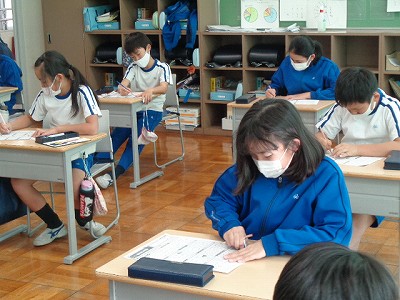 5時間目の算数では、説明力テストを行いました。文章を読んで理解し、その内容が正しいのかを自分の言葉で説明するという問題です。これまでの知識を活かし、一生懸命取り組んでいました。