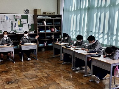1時間目はディベートゲームを行いました。月曜日に取り組んだ「思考力ドリル」のお題にあった「中学生は私服ではなく、制服を着るべきである」という議題で、審判・否定派・肯定派に分かれ討論を行いました。相手の意見を聞いて、話を返すという事がしっかりと出来ています。結果は否定派の勝利となりましたが、どちらもしっかりした立論が出来ていました。