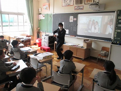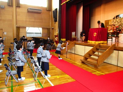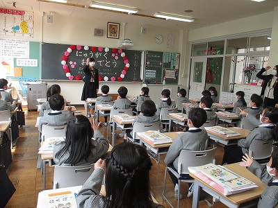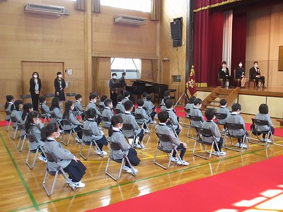 毎年、全校生の大きな拍手で迎えられる入学式ですが、今回は新型コロナウィルス感染拡大防止のために、時間と内容を短縮し、2~6年生の在学生は、教室で新1年生の見守りました。