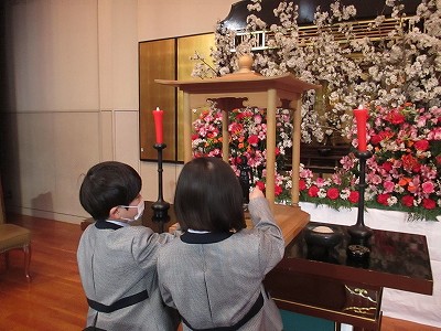 お二人のご誕生と、ピカピカの新1年生の入学をお祝いし、桜の花でいっぱいの「花まつり」入学式になりました。