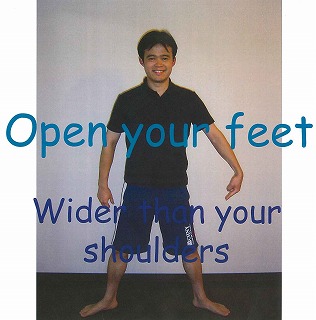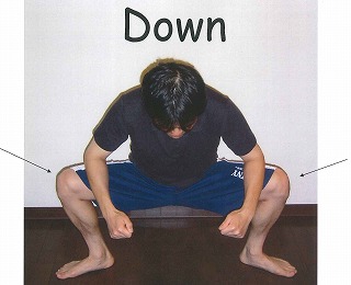 つまさきをそとにむけて、またを広げます。そして りょう足をまげてじっとします。