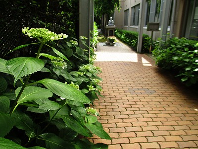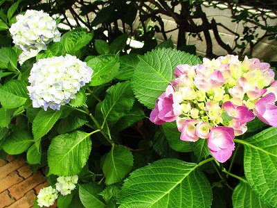 あじさいが、大きな葉を身にまとい、すくすくと成長しています。