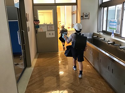 互いに距離をとりながら、家庭科室にお弁当を届けてくれています。