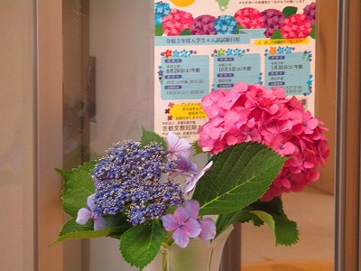 職員室前のカウンターにも、学校のアジサイを活けています。とても鮮やかです。