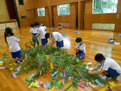 The children explained to me that the bamboo is decorated with wishes and luck pieces of paper. Then they asked me what I wished for this year on Tanabata!