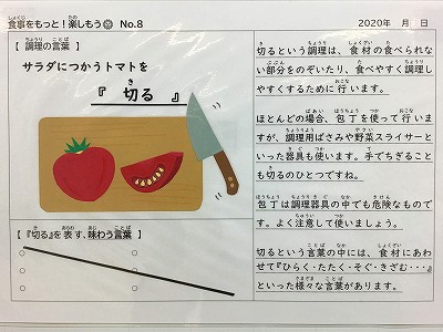 切るという調理は、食材の食べられない部分を除いたり、調理しやすいように、食べやすいようにするための作業です。切り方によって、「いちょうぎり、短冊切り…」などいろいろな切り方には名前があります。写真のトマトの切り方は「くし切り」と言います。