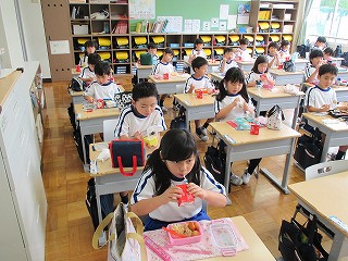 週末となりました。家庭科室へお弁当を届けに来てくれた子ども達から、「今日の朝も、お弁当を自分でつめてきた!」「昨日、お母さんに教えてもらって、お弁当箱を洗ってみた!」とうれしい報告がありました。