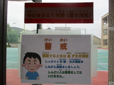 保健室です。コロナのことも心配ですが、本格的に、熱中症にも気をつけなければならない季節になりました。暑さ対策の一環として、グラウンド側の入口に、「今のWBGT指数(暑さ指数)」の掲示をしてあります。