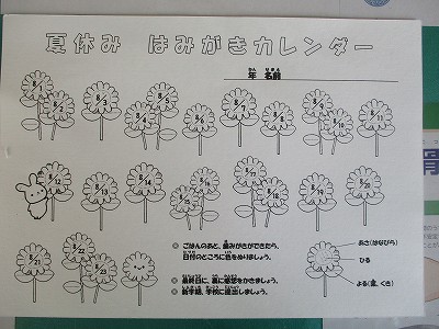 保健室です。無事に夏休みを迎えることが出来ました。今年の夏休みも「歯みがきカレンダー」をお配りしています。