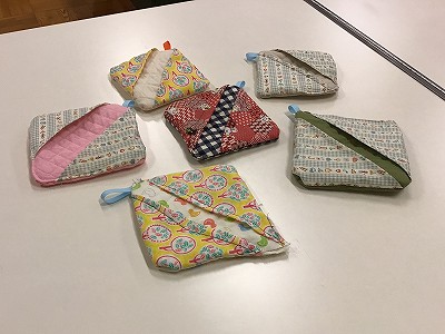 素敵な鍋つかみが完成しました!裏返せばキルト生地の「鍋しき」としても使えます。みんな前回のことを思い出しながら、手際よく作業が進められていました。