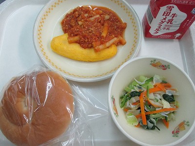 今日は今学期、初めてのパン給食でした。ひと口大にちぎり、マナーを守っておいしくいただきました。ミートソースには、ミキサーで細かく砕いたくさんの野菜が入っています。人参、玉ねぎ、大豆、豚ひき肉をトマトピューレと鶏ガラスープでよく煮込んで、うま味をたくさん引き出します。