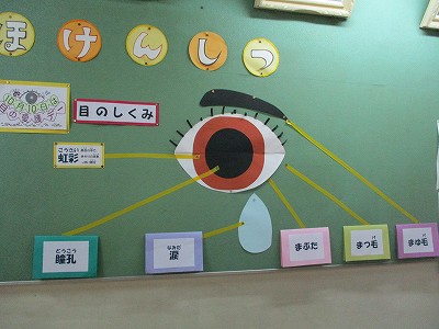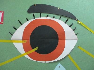 10月10日「目の愛護デー」を前に、保健室前に大きな「目」を掲示しました。目の働きについての掲示です。
