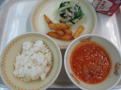 チリコンカーンはアメリカ合衆国南部の国民的な料理です。豆とひき肉をトマトピューレでしっかり煮つめて作りました。ほどよいトマトの酸味で、やわらいでおいしく食べられました。チンゲン菜、大根、もやし、ちくわのおひたしも野菜の加熱の仕方をそれぞれ工夫しておいしく食べられるようにしました。