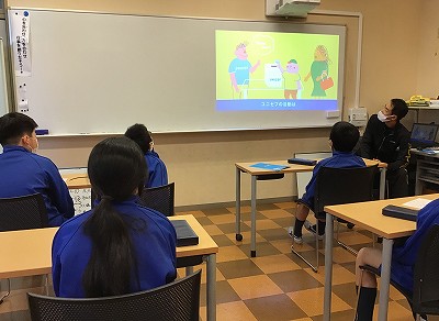 「100円でできること」のユニセフ発信動画をもとに、「きれいな水が作れる“浄水剤”」「貧困地域の子ども達に栄養を届ける“ミラクルフード”」「この一箱で40人の学習が可能な“箱の中の学校”」などの例につなげています。文教キッズの思いが具体的な物として届けたいという目標を持って取り組もうと、熱い意見交換が実現しました。