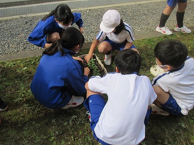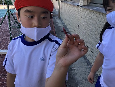 今日、2年生は、畑から、これもまた“むらさき色のサツマイモ”を掘り出していました。そんな2年生達のところに、偶然とは思えない“むらさきバッタ”の出現!同じ畑にいたのかも?!