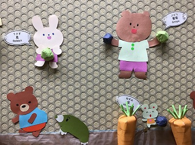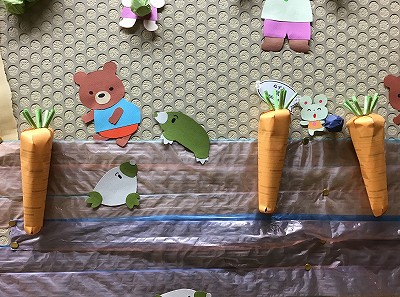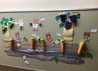 文教キッズのみなさん、ぜひ1階廊下の掲示版を見に来て下さいね。(ニンジンは触れたり、収穫できたりして遊べるそうです!)