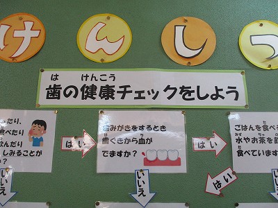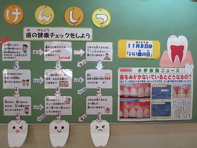 保健室です。11月8日は「いい歯の日」でしたので、保健室前の掲示も歯にちなんだものになりました。「歯の健康チェックをしよう」は、「はい・いいえ」でたどっていくと、今、どれくらい「いい歯」なのかが分かるようになっています。