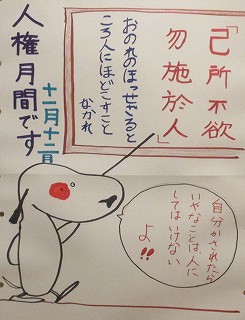 先々週に紹介した論語「己の欲せざる所、人に施すこと勿かれ」の確認です。併せてインフォメーション委員が廊下掲示しているポスターの紹介もありました。自分もみんなも気持ちのよい学校生活を送るために、自分がしてほしくないことを他人にはしません。