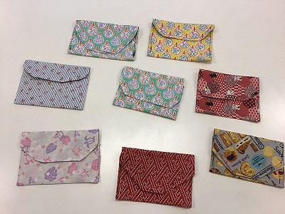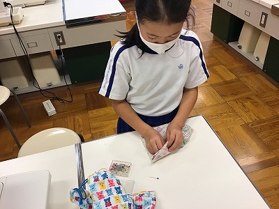 今日のECO生活クラブは、“ミシンで簡単マスクケース作り②”です。前回の続きでケースの仕上げを行いました。入れ物になる部分と蓋になる部分をうまく折って重ねます。