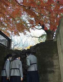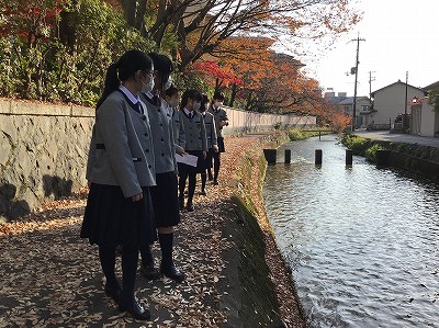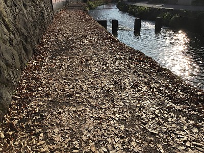 学校を出て白川沿いを歩くと、落ち葉のじゅうたんが広がっていました。