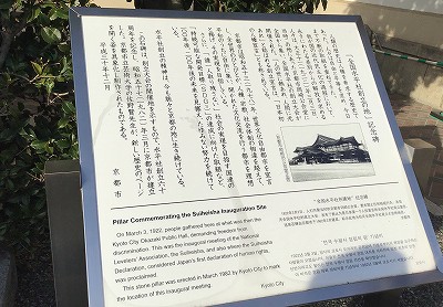 時代は異なりますが、六勝寺を解説した看板のすぐ傍に、「全国水平社創立の地」記念碑を見つけました。
